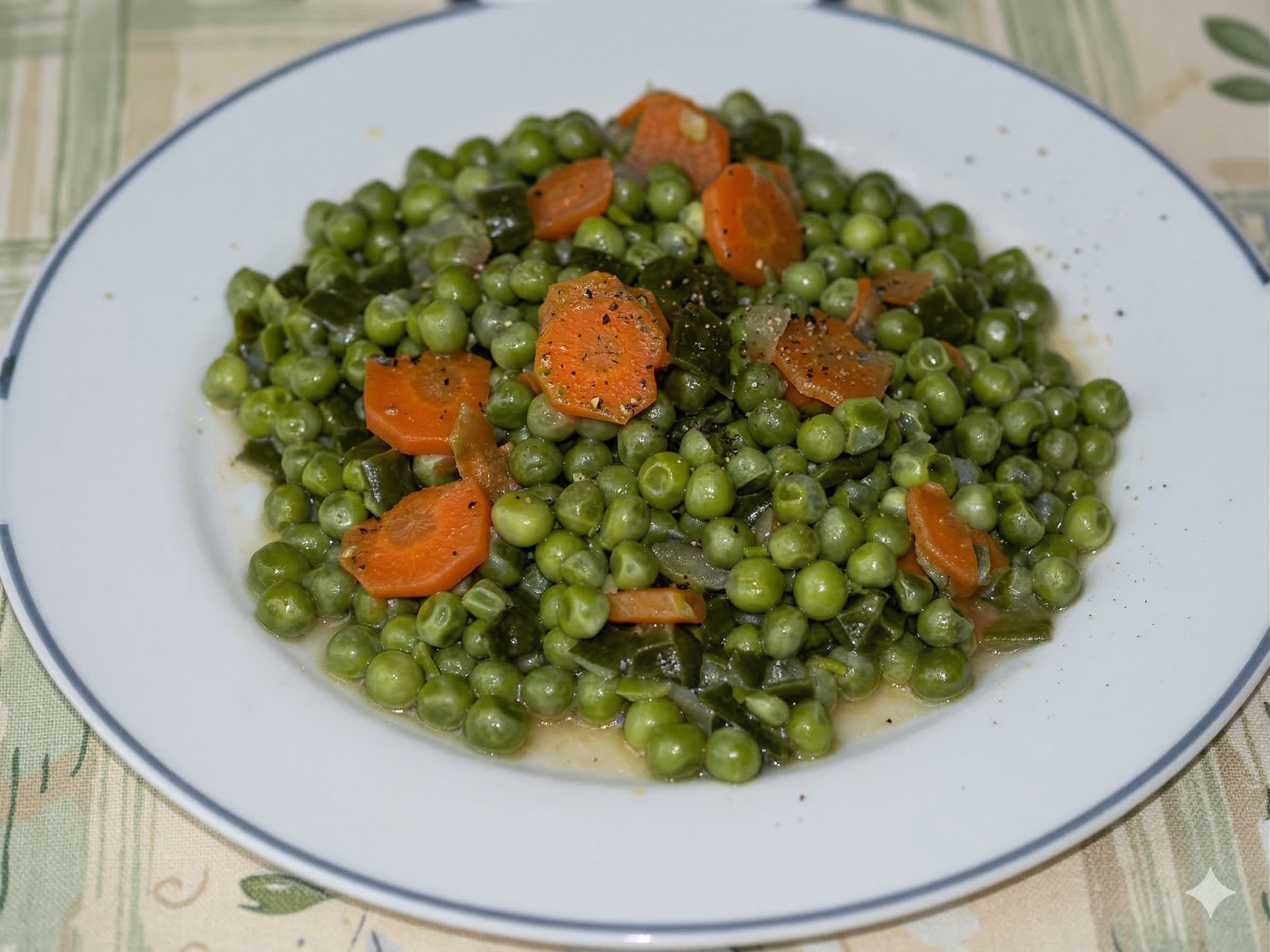 - Hozzáadjuk a zöldborsót, a vízt, a sűrített paradicsomot, sózzuk és borsozzuk. Fedőt alatt alacsony fokozaton 20-30 percig főzzük az ételt.