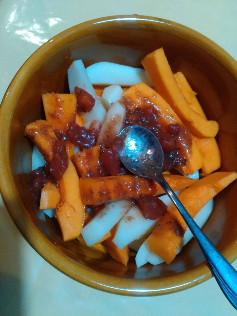 • Meghámozuk és vékony hasábokra vágjuk fel a sütőtököt és a burgonyát